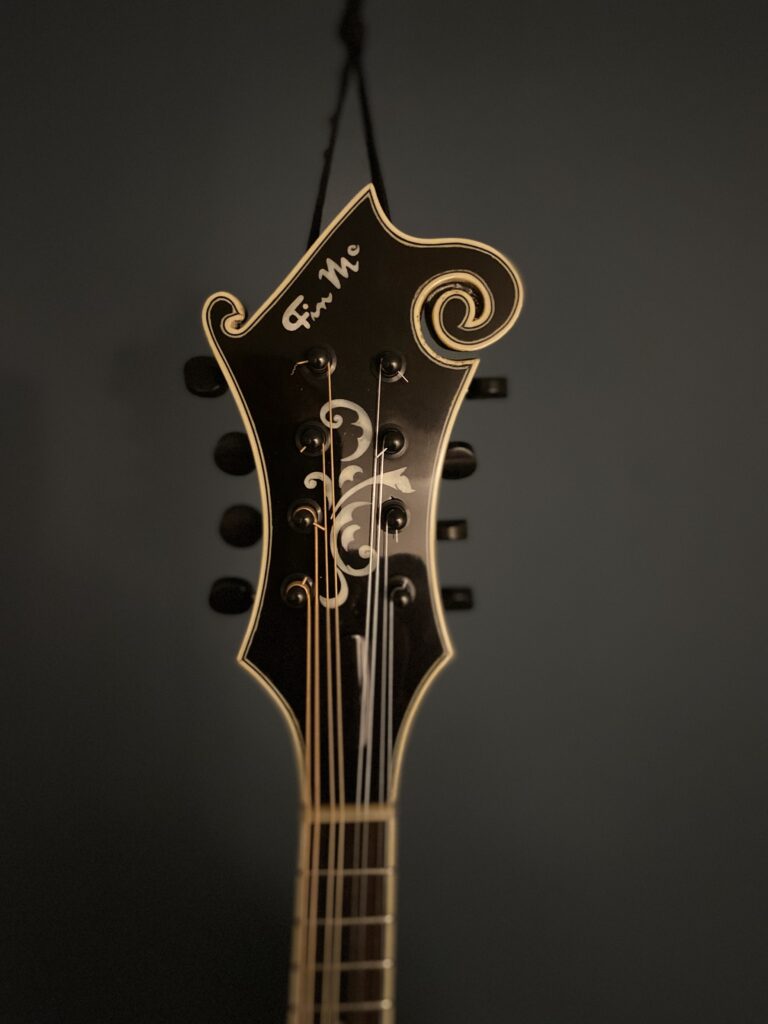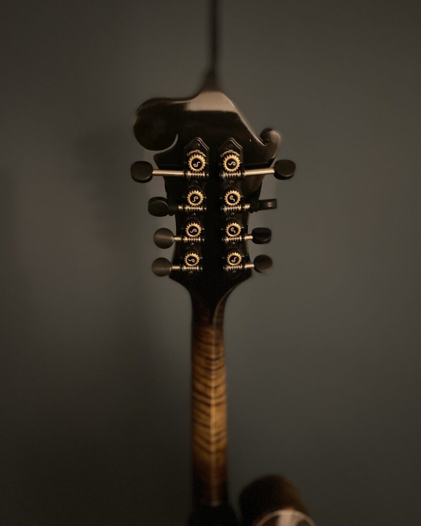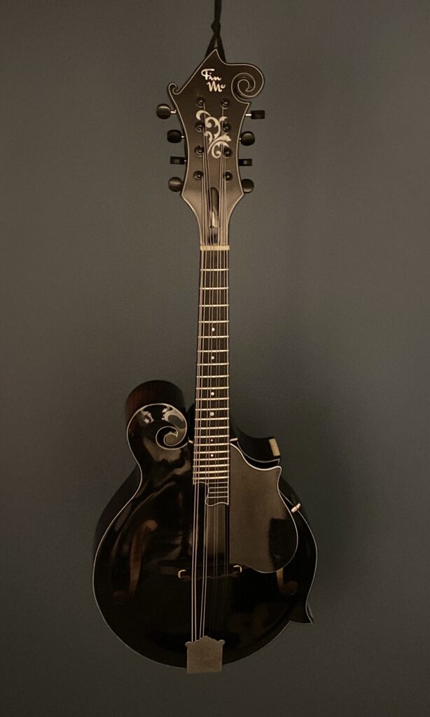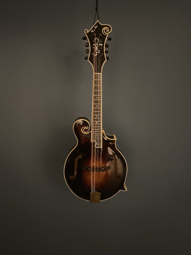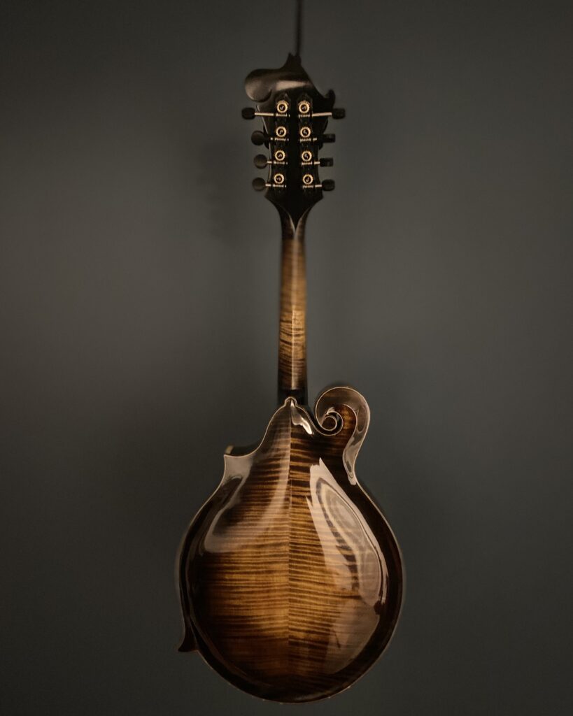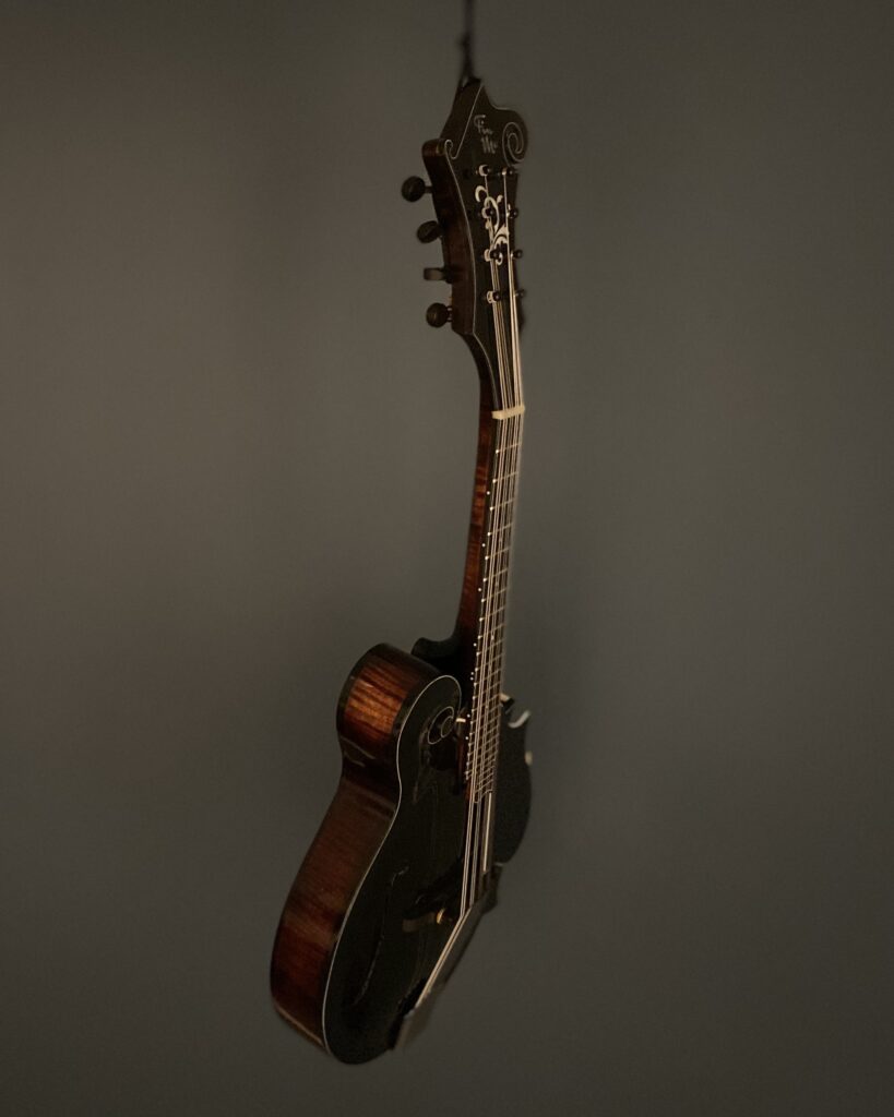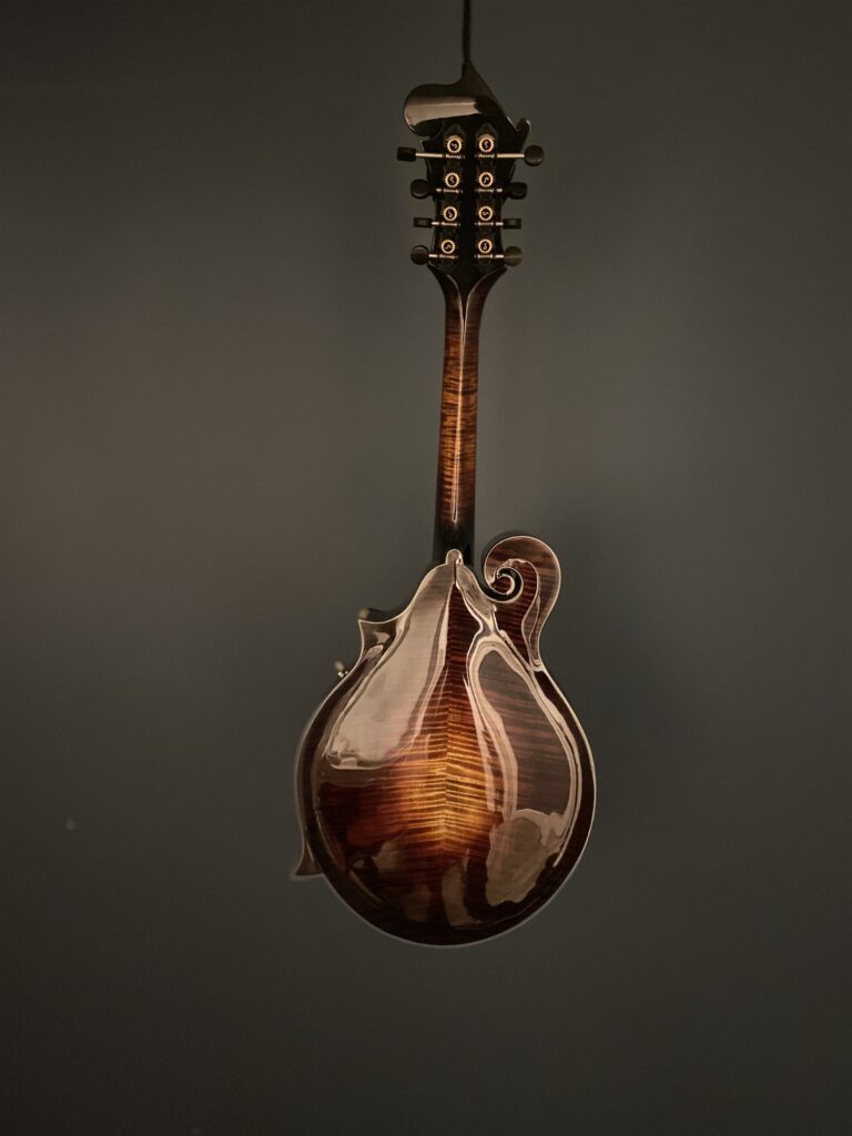 The Specs: The X in the title refers to the extra depth of the body totalling 77mm. Adirondack Top with off parallel tone bars. Curly Maple Back, Sides & Neck. Ebony Handmade adjustable Bridge calibrated for each string. Neck has a 1 1/8″Bone Nut. Ebony 12″ Radiused Fingerboard with 13 7/8″ Fret Length and 0.40″ high , 0.80″ wide frets. Double action Truss Rod. Mandolin points are bone. Hand applied Stain and thin nitro cellulose Lacquer Finish over a shellac undercoat. Schaller Grand tune Tuners. Golden Age Tailpiece. Top and side Pinstriped nitro celluloid Binding. Mother of Pearl Inlays and fret markers. this instrument has plenty of volume and the deeper body adds a complexity in tone. Comes in a Standard Hard Shell case.